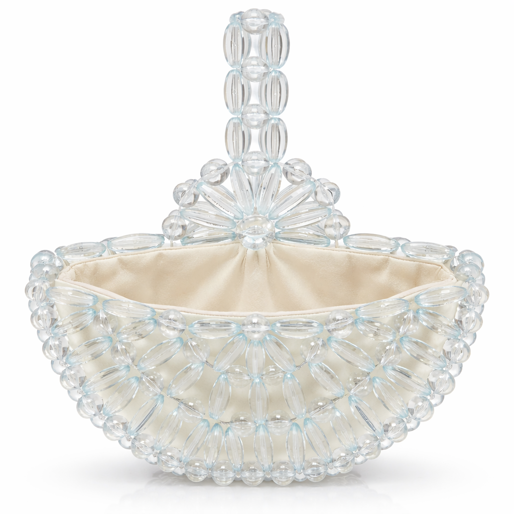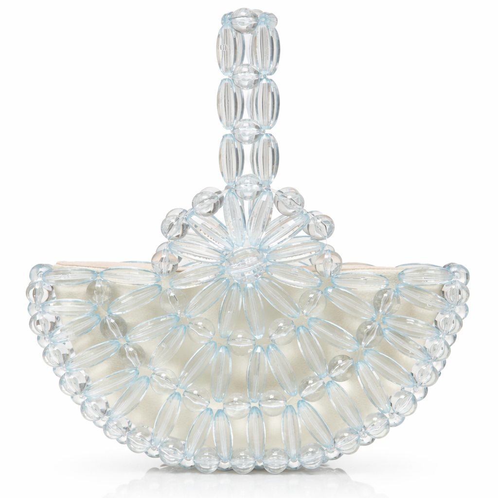 Atelier Emine’in Crystal Gelato Couture koleksiyonuna ait Melo Snowfall, merkezden dışa doğru genişleyen radyal örgü mimarisiyle tasarlanmış, heykelsi karaktere sahip premium el yapımı kristal mini çanta modelidir.