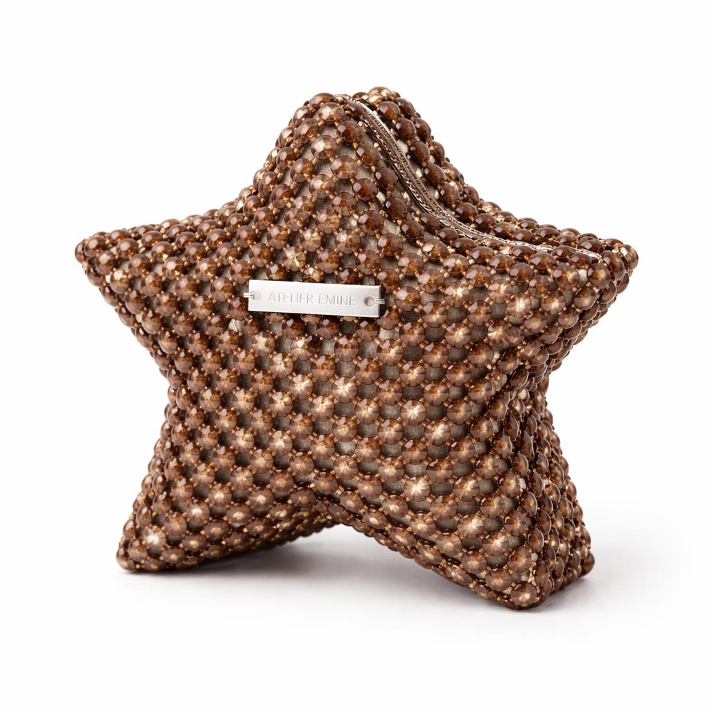 Atelier Emine’in Crystal Gelato Couture serisine ait Mielo Castagna, üç boyutlu yıldız formu esas alınarak tasarlanmış; 8 mm optik sınıfı kristal boncukların yüksek dayanımlı misina ile tek tek örülmesiyle üretilmiş, heykelsi nitelik taşıyan premium mini clutch modelidir.