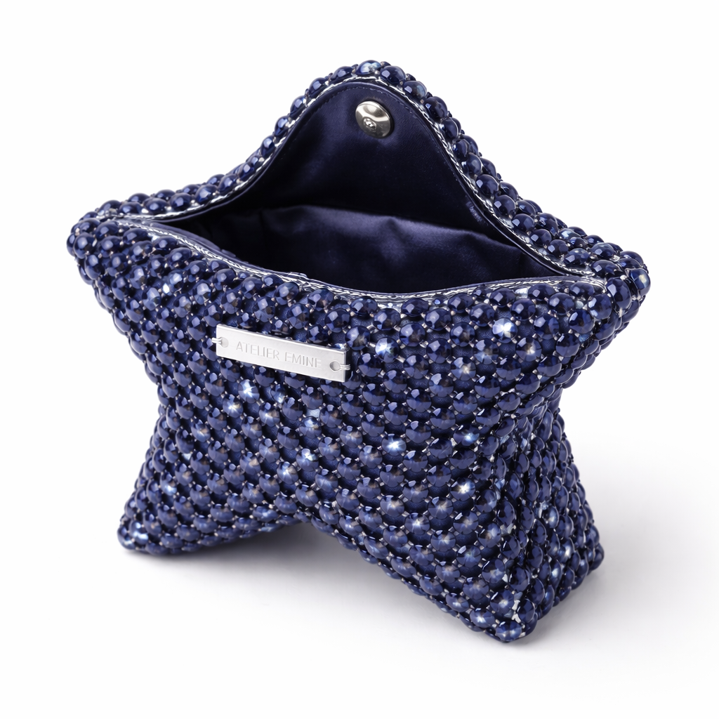 Atelier Emine’in Crystal Gelato Couture serisine ait Mielo Profondo, üç boyutlu yıldız formu esas alınarak tasarlanmış; 8 mm optik sınıfı kristal boncukların yüksek dayanımlı misina ile tek tek örülmesiyle üretilmiş, heykelsi nitelik taşıyan premium mini clutch modelidir.