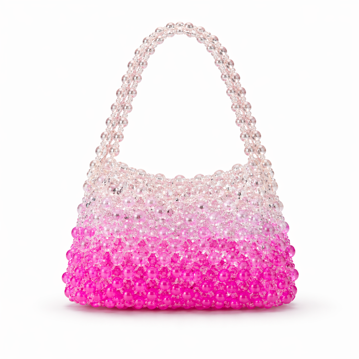 Çanta yüzeyi, her biri çok yüzeyli kesime sahip kristal boncukların dairesel halkalar oluşturarak birbirine bağlanmasıyla kurgulanmış açık kafes (lattice) strüktür üzerinden yükselir. Bu örgü sistemi, yüzeyde güçlü bir ışık kırılımı ve çok katmanlı bir doku derinliği yaratarak çantaya mücevher etkili, mimari bir karakter kazandırır.