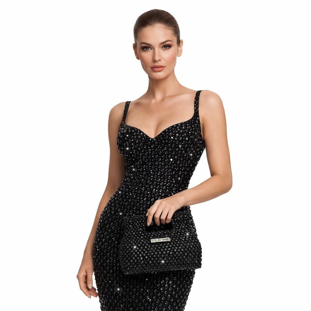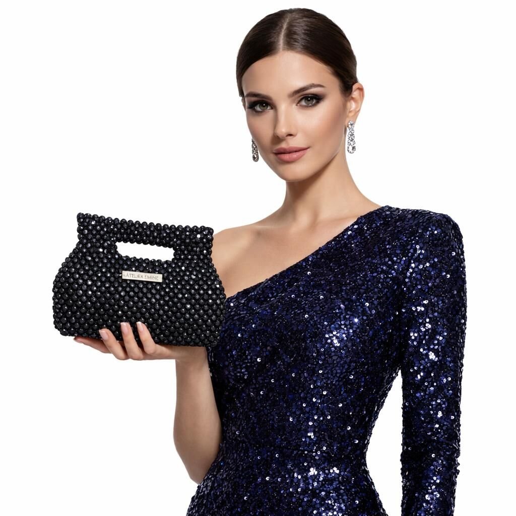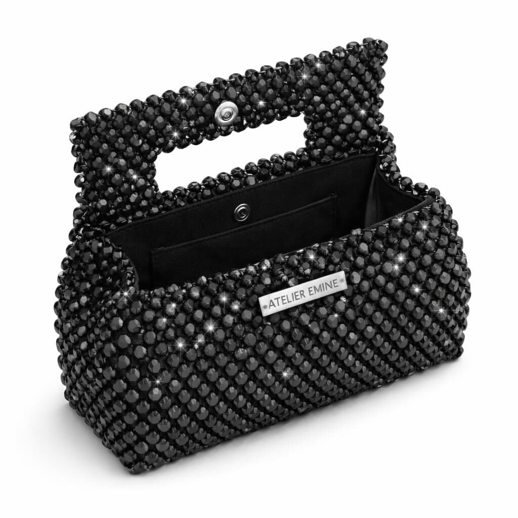 Atelier Emine’in Crystal Gelato Couture serisine ait Panna Liquorice, 8 mm optik sınıfı kristal boncukların yüksek dayanımlı misina ile tek tek örülmesiyle üretilmiş, formu gövdeyle bütünleşik top-handle yapıya sahip premium clutch modelidir.