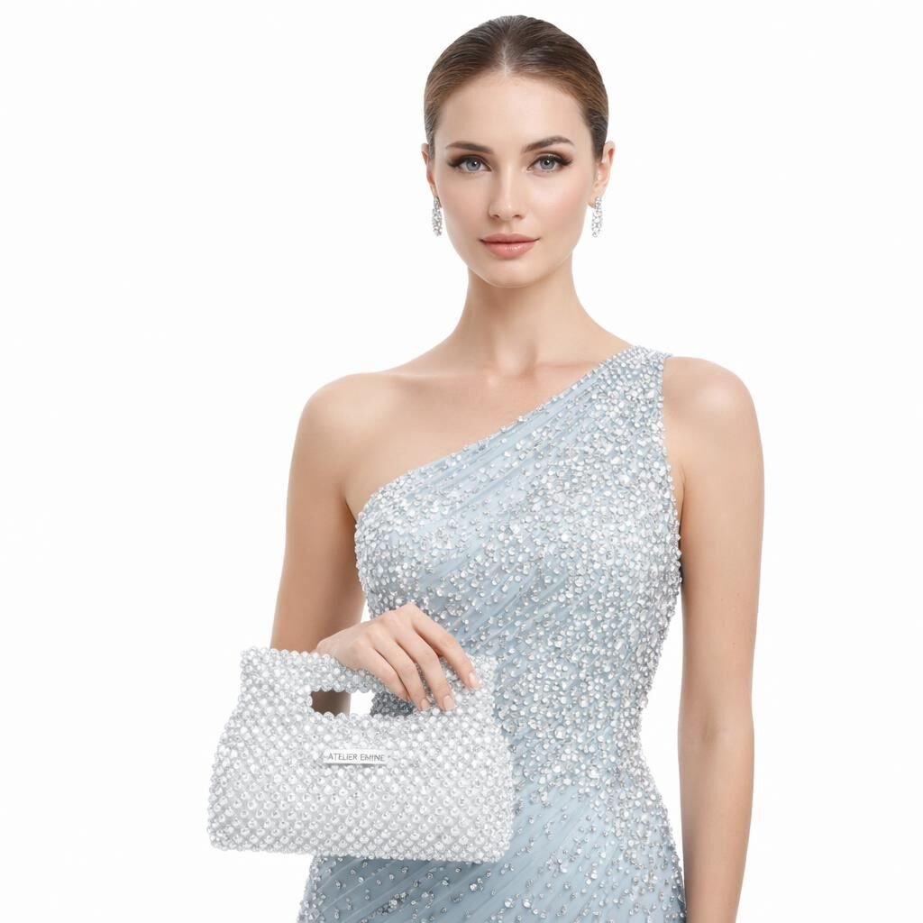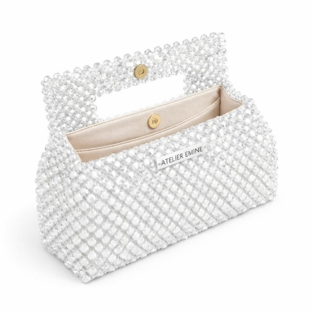 Atelier Emine’in Crystal Gelato Couture serisine ait Panna Milk, 8 mm optik sınıfı kristal boncukların yüksek dayanımlı misina ile tek tek örülmesiyle üretilmiş, formu gövdeyle bütünleşik top-handle yapıya sahip premium clutch modelidir.