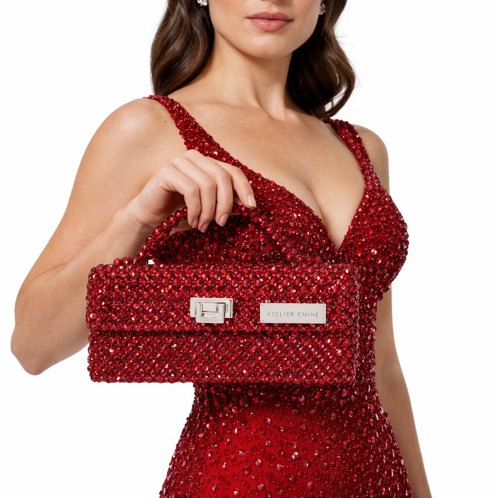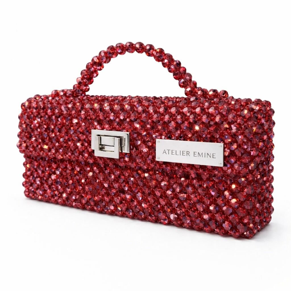 Atelier Emine’in Crystal Gelato Couture serisine ait Panna Wine, 8 mm optik sınıfı kristal boncuklar, üst taşıma kulpu, metal kilit mekanizması ve saten astar kullanılarak tamamen el işçiliğiyle üretilmiş premium top-handle clutch modelidir.