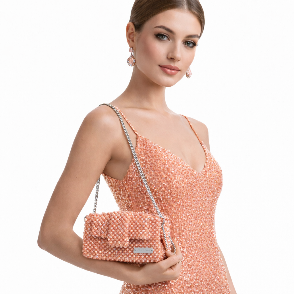 Atelier Emine’in Crystal Gelato Couture serisine ait Panna Petal, 8 mm optik sınıfı kristal boncuklar, metal omuz zinciri ve saten astar kullanılarak tamamen el işçiliğiyle üretilmiş premium clutch modelidir.