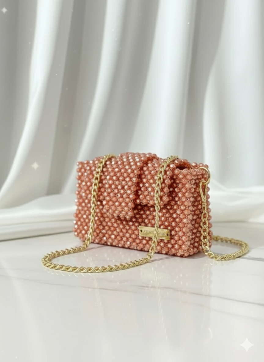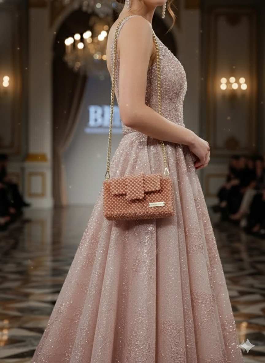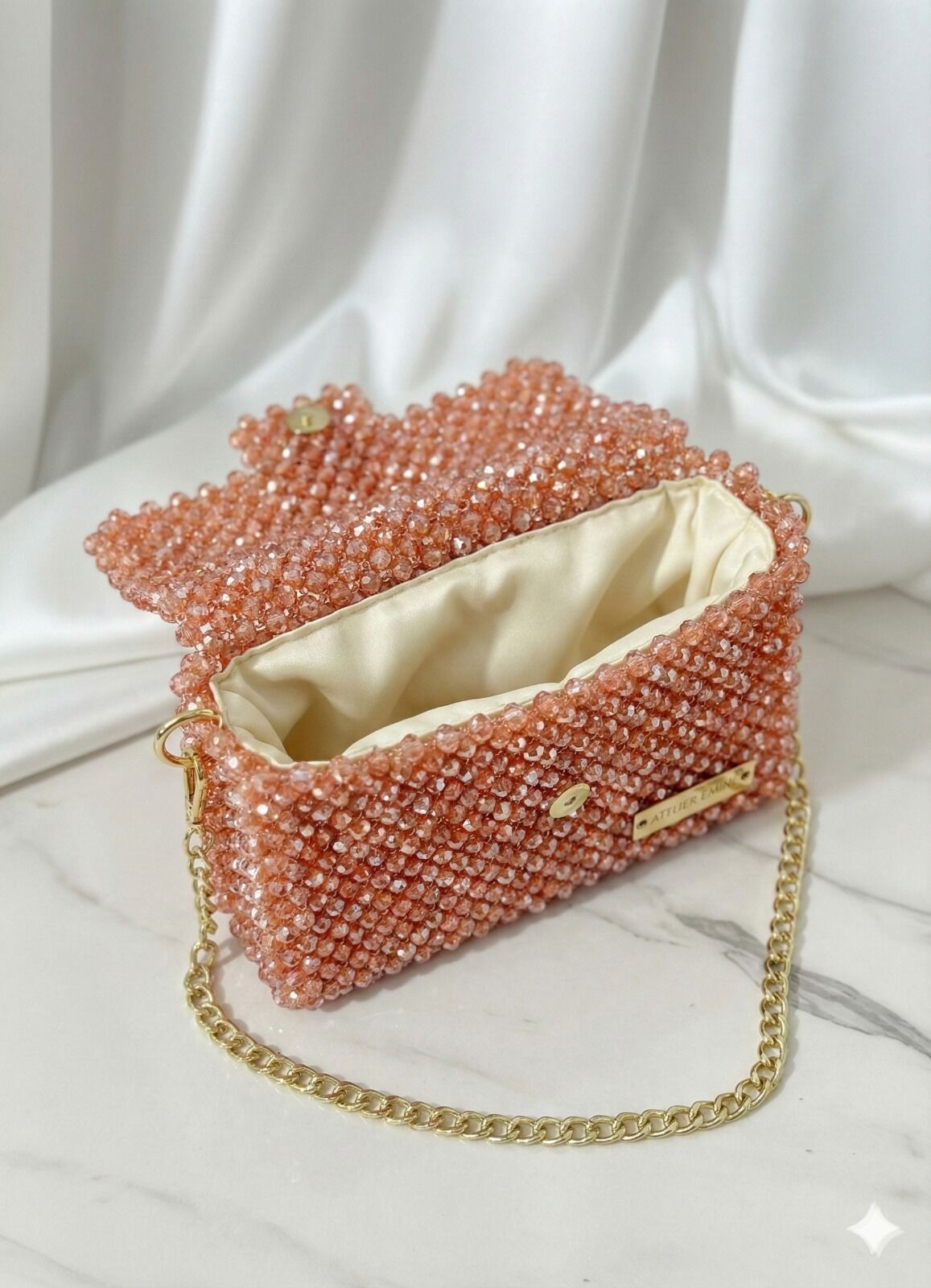 Atelier Emine’in Crystal Gelato Couture serisine ait Pink Blossom Sorbet, 8 mm optik sınıfı kristal boncuklar, 316L paslanmaz çelik kulp ve saten astar kullanılarak tamamen el işçiliğiyle üretilmiş premium clutch modelidir.