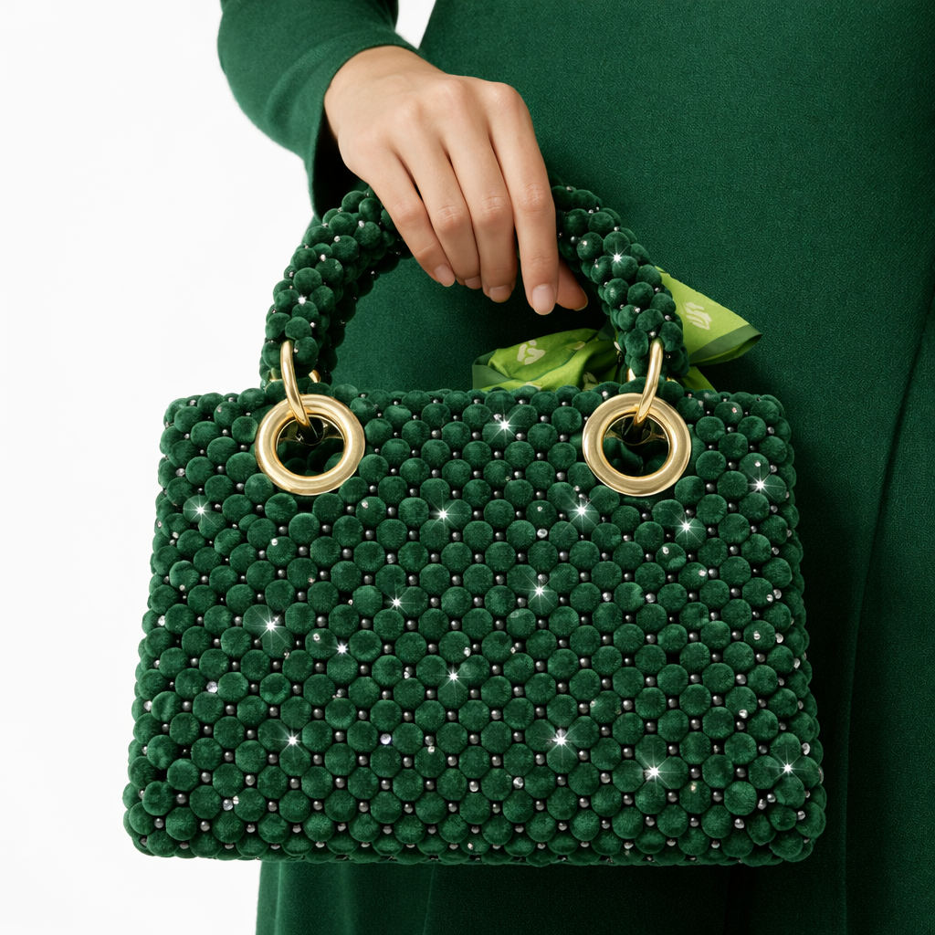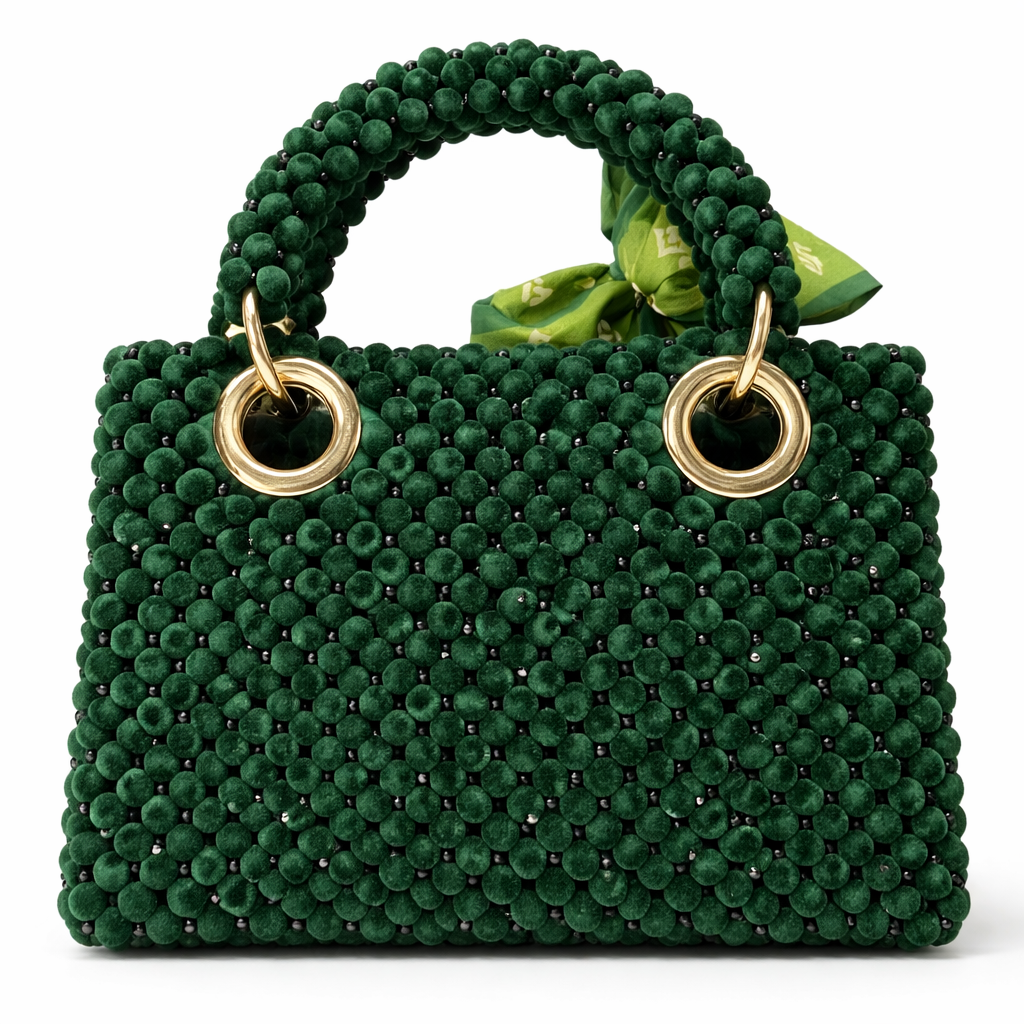 Gövdeye entegre yarım ay formundaki kulp, aynı boncuk örgü tekniğiyle üretilmiş olup, metal halka bağlantılarıyla gövdeye bağlanır. Parlak metal halkalar, kadife yüzeyin mat dokusunu kesen yapısal ve grafik bir vurgu işlevi görür. Bu detay, çantanın hem takı benzeri bir obje olarak algılanmasını hem de mekanik dayanımını güçlendirir.