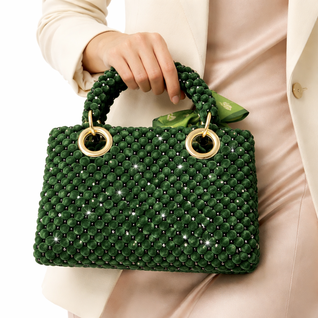 Silva Moss’un strüktürü, boncukların birbirine kilitlenen örgü düzeni sayesinde dikişsiz ve kesintisiz bir yüzey bütünlüğü sunar. Boncuk aralarındaki mikro boşluklar, yüzeyde doğal bir derinlik ve ritim oluşturarak tasarıma organik ama kontrollü bir karakter kazandırır. Bu yoğun örgü, çantaya heykelsi bir hacim verirken, couture seviyesinde bir işçilik algısı yaratır.