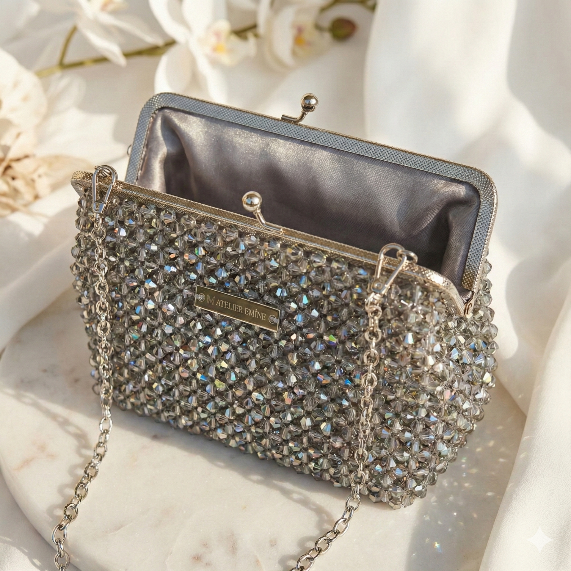 Atelier Emine’in Crystal Gelato Couture serisine ait Silver Dusk Sorbet , 8 mm optik sınıfı kristal boncuklar, 316L paslanmaz çelik kulp ve saten astar kullanılarak tamamen el işçiliğiyle üretilmiş premium clutch modelidir.