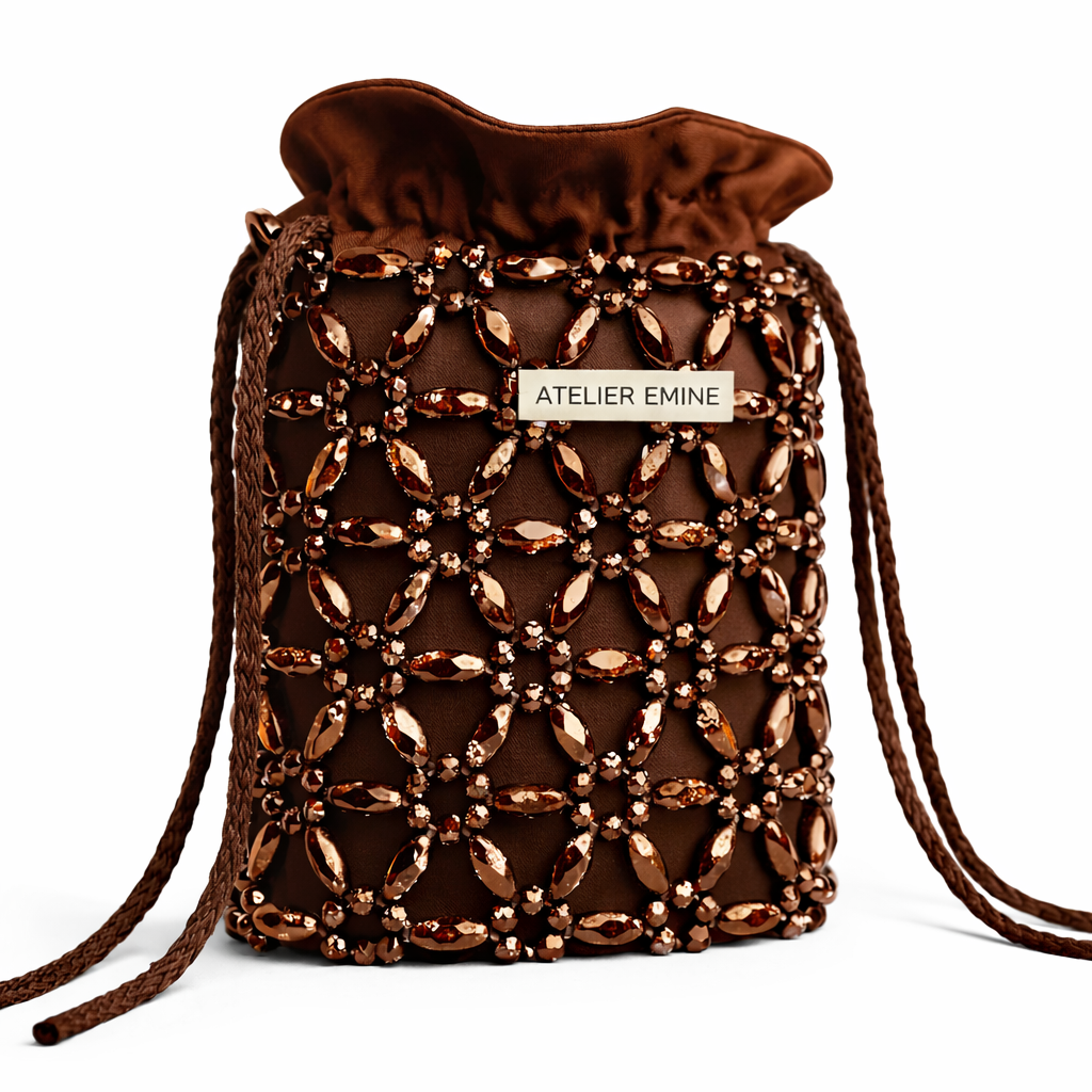 Ön yüzeyde yer alan Atelier Emine marka plakası, kristal örgü dokuyu bölmeden, minimal ve dengeli bir konumlandırmayla entegre edilmiştir. Sorbetto Biscotto, yumuşak hacmi, el işçiliği yoğun örgü yapısı ve couture detay yaklaşımıyla Crystal Gelato Couture koleksiyonunun daha akışkan ve feminen karakterli parçalarından biridir.