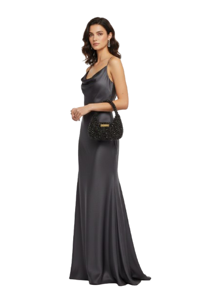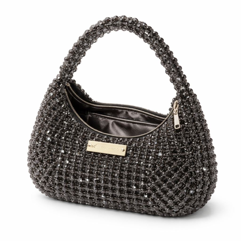 Üst taşıma kulpu, gövdeyle tek parça halinde kristal örgüden oluşturulmuş olup, elde taşıma ergonomisini destekleyen kavisli form ve dengeli kalınlığa sahiptir. Kulplu yapı, çantanın genel akışkan formunu koruyacak şekilde gövdeyle bütünleşir.