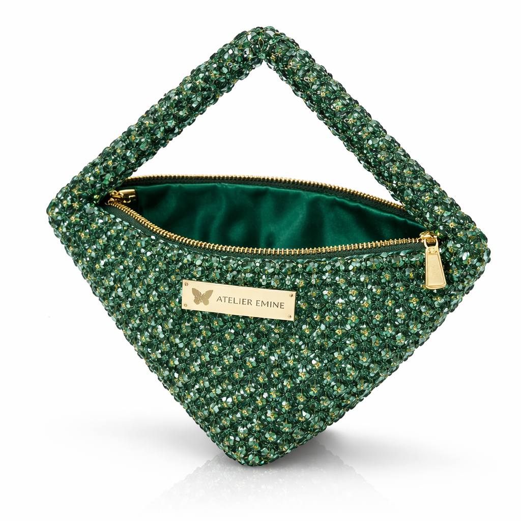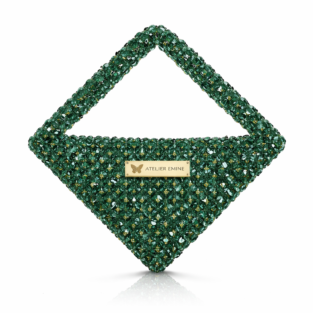 Atelier Emine’in Crystal Gelato Couture serisine ait bu tasarım; 8 mm optik sınıfı kristal boncuklar kullanılarak, tamamen el işçiliğiyle üretilmiş geometrik formlu premium mini çanta modelidir.